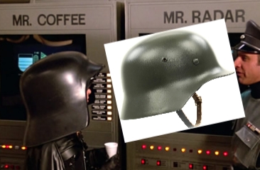 From the side, his helmet looks a lot like a massive version of the Stahlhelm, the German soldier helmet used primarily in the second world war.